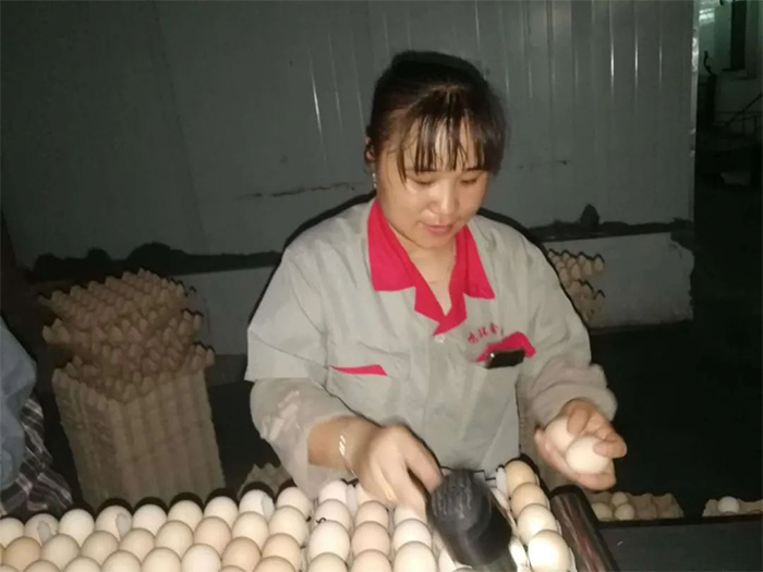事情中,,,,,,,张莉与照蛋组的家人们右手持灯逐个逐行地照,左手将无精蛋、弱精蛋、死精蛋、臭蛋、破蛋等挑出放在身旁的纸箱里,,,,,,,将小头朝上的蛋翻过来,,,,,,,照蛋历程头脑、行动反应要快,,,,,,,对某个种蛋的视察、判断要在一瞬间完成,,,,,,,做到 “轻、稳、准、快”。。。。。。张莉向导的照蛋组为镌汰细菌污染胚蛋、提高孵化率和雏鸡质量、合理使用装备、准确推测孵化效果及种鸡的生产状态打下坚实的基础。。。。。。